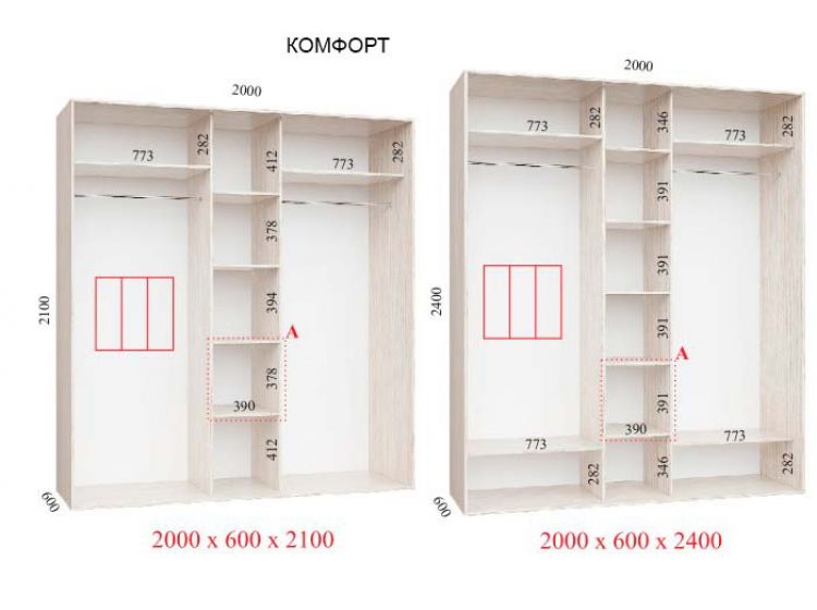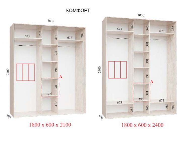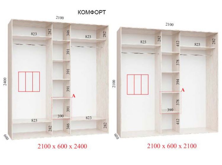 На рисунке сверху мы предлагаем Вам несколько вариантов наполнения шкафов-купе. Схема разработана с учетом пожеланий и требований потребителей, удобности использования данного элемента мебели и технологический свойств материалов, используемых в производстве. По Вашему желанию схема шкафа может быть выполнена в зеркальном отображении. Можно добавлять полки, штанги микролифты. Можно изменить размеры расстояний между полками и стоевыми, изменить высоту и глубину шкафа с шагом до 1 см, т.е. Вы можете заказать шкаф-купе, например высотой 2,36 м и глубиной 0,56 м. В стандартных вариантах предоставлены две высоты шкафов 2,40 м и 2,10 м и глубиной 0,45 м и 0,6 м Вы же можете заказать мебель необходимого Вам размера.